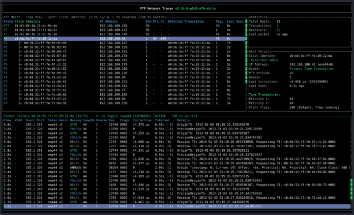 PTP Trace je nástroj pro monitorování a analýzu PTPv2 (Precision Time Protocol) sítí v reálném čase i offline z PCAP souborů. Zajišťuje automatické vyhledávání PTP hostitelů na UDP portech 319/320, barevné rozlišení typů PTP zpráv, multicast memberhip handling, živý capture pomocí pnet, automatickou detekci Primary Time Transmitter (PTT), či zobrazení stromové struktury mapující vztahy vysílač – přijímač.