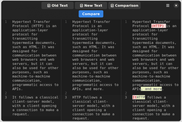 Jak už název napovídá, jedná se o aplikaci zaměřenou na porovnávání textu. Nabízí moderní rozhraní GTK/Libadwaita a tři hlavní panely: Starý text, Nový text a Náhled porovnání. Nabízí funkce jako porovnání v reálném čase, citlivost na velká/malá písmena, světlý a tmavý motiv nebo čtyři režimy porovnání: znaky, slova, řádky, věty.