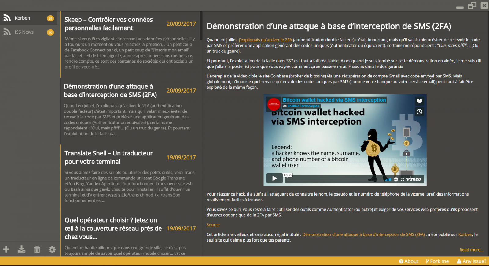 Čtečka novinek přes RSS, Atom a JSON. Používá podle slov tvůrců ergonomické a krásné grafické prostředí. Má automatickou detekci jazyků, takže v arabštině a hebrejštině přepíná zobrazení zprava doleva. Dále má nastavitelnou dobu obnovení novinek a automatické aktualizace.