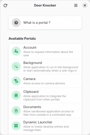 Aplikace, která umožňuje zkontrolovat dostupnost portálů xdg-desktop-portal. Můžete kliknout na každou jednotlivou aplikaci a zjistit, zda je implementace portálu nalezena nebo chybí. XDG Desktop Portal je portálová frontendová služba pro Flatpak.