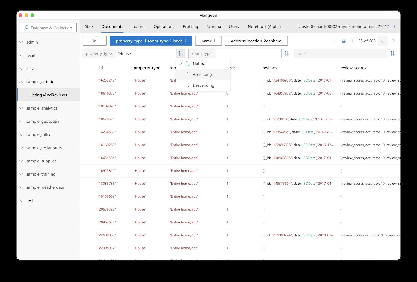 Mongood je nástroj pro práci s MongoDB databázemi. Umožňuje zobrazit stav databáze, vyhledávat a řadit data, zobrazit bod na mapě na základě geografických údajů, procházet data v režimu dokumentu, upravovat data s pomocí Monaco Editoru, exportovat dokumenty, spravovat indexy, editovat JSON schémata a analyzovat výkon.