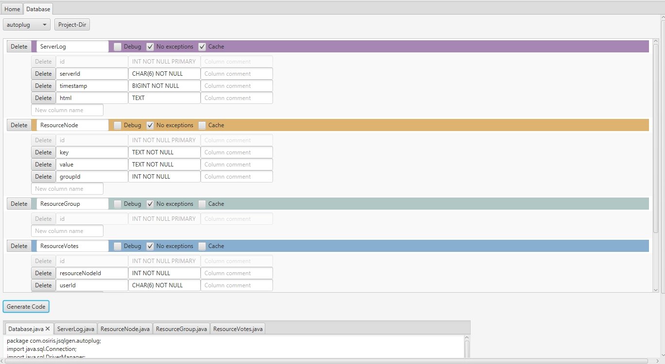 jSQL-Gen je nástroj pro generování Java (JDBC) a SQL kódu. Umožňuje vytvořit databázi, tabulky a jejich sloupce pomocí grafického rozhraní, nastavit datové typy a nechat si vygenerovat kód, který můžete přidat do svého projektu. Kód zahrnuje samostatnou třídu pro každou z tabulek. V těchto třídách jsou statické metody pro získání, přidání, úpravu či mazání záznamů. Vygenerován je také SQL kód, který založí tabulky v databázi.