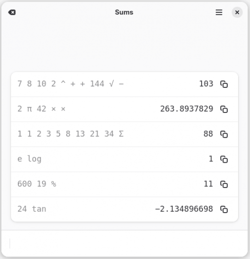 Kalkulačka navržená pro GNOME, s postfixovým zápisem, známým jako reverzní polská notace (RPN). Je velmi klávesnicově orientovaná, což usnadňuje její ovládání bez nutnosti používat myš.