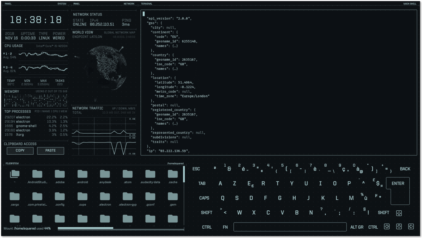 Desktopová aplikace napodobující grafické rozhraní ve stylu sci-fi filmů. Inspiruje se hlavně u snímku TRON: Legacy. Běží v terminálu a zobrazuje aktuální informace o vašem systému. Primárně je určen pro dotykové obrazovky, běží ale stejně dobře i na klasickém desktopu.