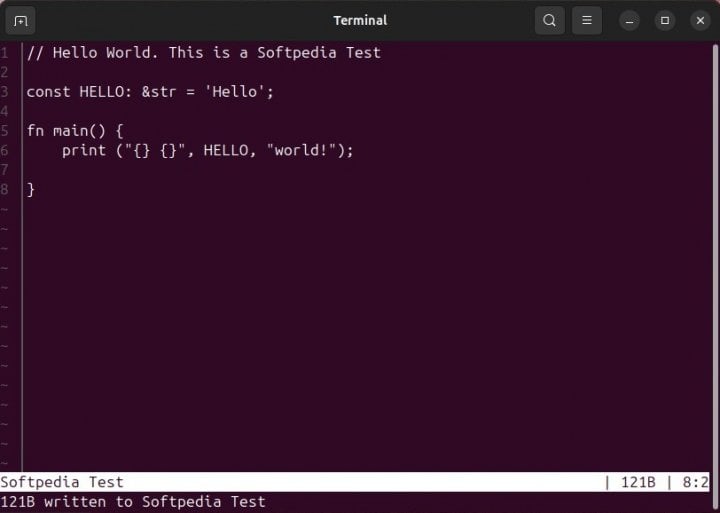 Jednoduchý editor kódu kompletně napsaný v jazyce Rust v méně než 1024 řádcích kódu s minimálním počtem závislostí. Může se pochlubit podporou UTF-8, inkrementálním vyhledáváním, zvýrazňováním syntaxe (pro Rust) a podporou čísel řádků. K dispozici je také podpora oddělovače konce volby, podpora skoku na řádek/sloupec, zvýraznění syntaxe, ukládání jako výzva (pokud nebylo zadáno jméno) a možnost duplikovat řádky a skákat mezi slovy.