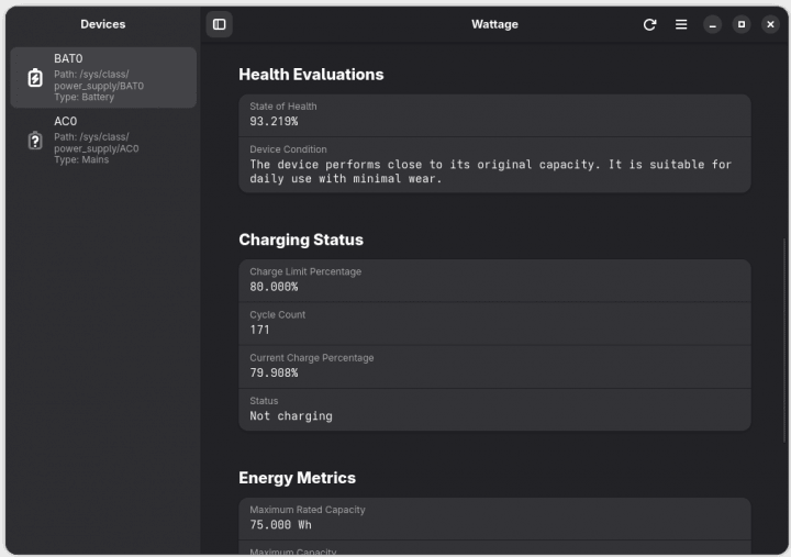 Nástroj, jehož cílem je co nejpřesněji informovat o stavu a zdraví baterie vašeho zařízení s Linuxem. Jedná se aplikace GTK4/libadwaita kompletně napsanou v jazyce Vala. Na základě toho, jakou distribuci Linuxu používáte a na jakém zařízení, může zobrazit širokou škálu informací.