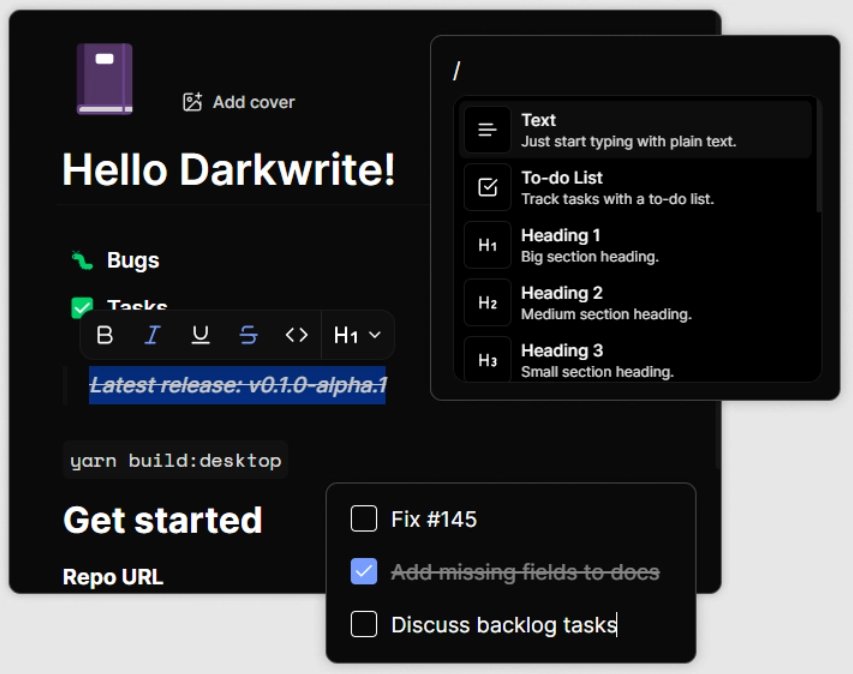 Darkwrite je aplikace pro psaní poznámek a správu úkolů. Nabízí editor s podporou formátování textu a vkládání nadpisů, seznamů úkolů, číslovaných seznamů, odkazů či obrázků. Je také možné měnit písma pro jednotlivé poznámky a přidávat úvodní obrázky k poznámkám.