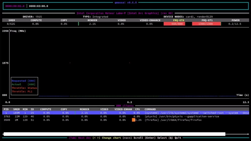 qmassa! je terminálový nástroj určený k zobrazování statistik využití GPU. Poskytuje informace o zařízeních a procesech využívajících GPU. Rozsah zobrazovaných informací lze ovlivnit pomocí parametrů. Většina informací je získávána prostřednictvím souborů v adresářích /proc a /sys nebo pomocí udev, což do určité míry zajišťuje nezávislost na ovladači a konkrétním výrobci GPU.