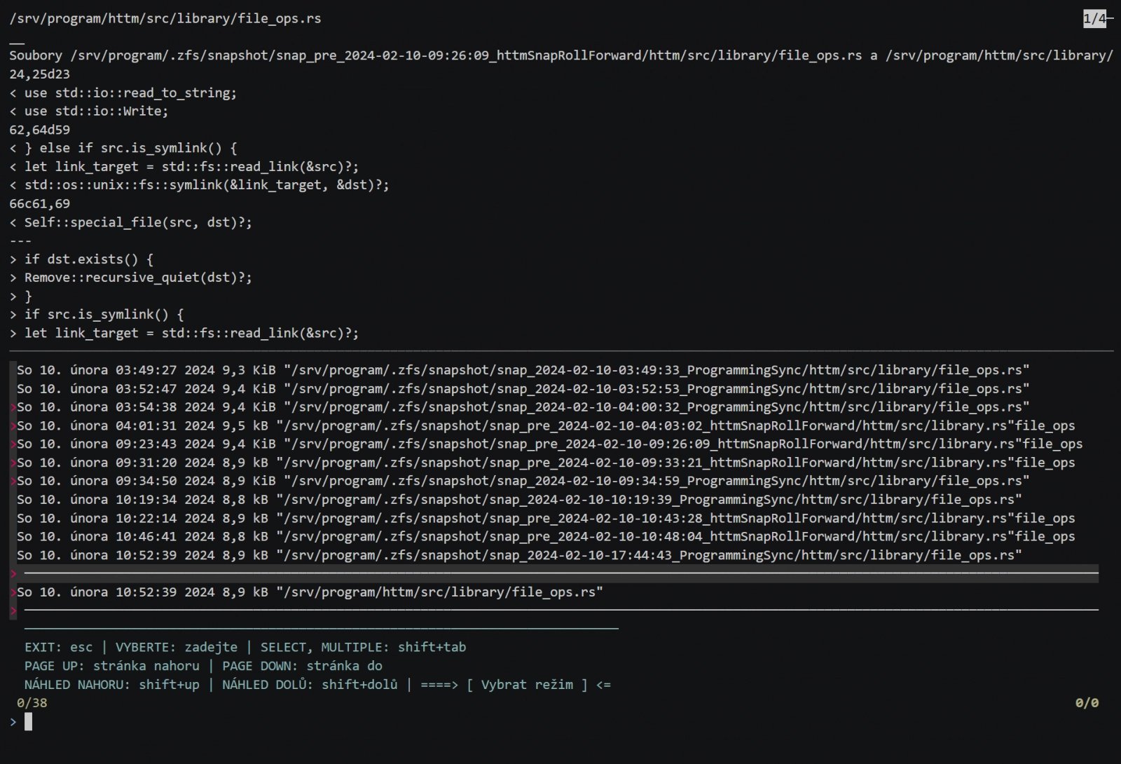 httm je nástroj v CLI, který nabízí funkce podobné Time Machine pro souborové systémy jako ZFS, Btrfs a NILFS2. Umožňuje uživatelům prohlížet a obnovovat předchozí verze souborů přímo ze snapshotů. Kromě toho podporuje práci s Time Machine a Restic zálohami.