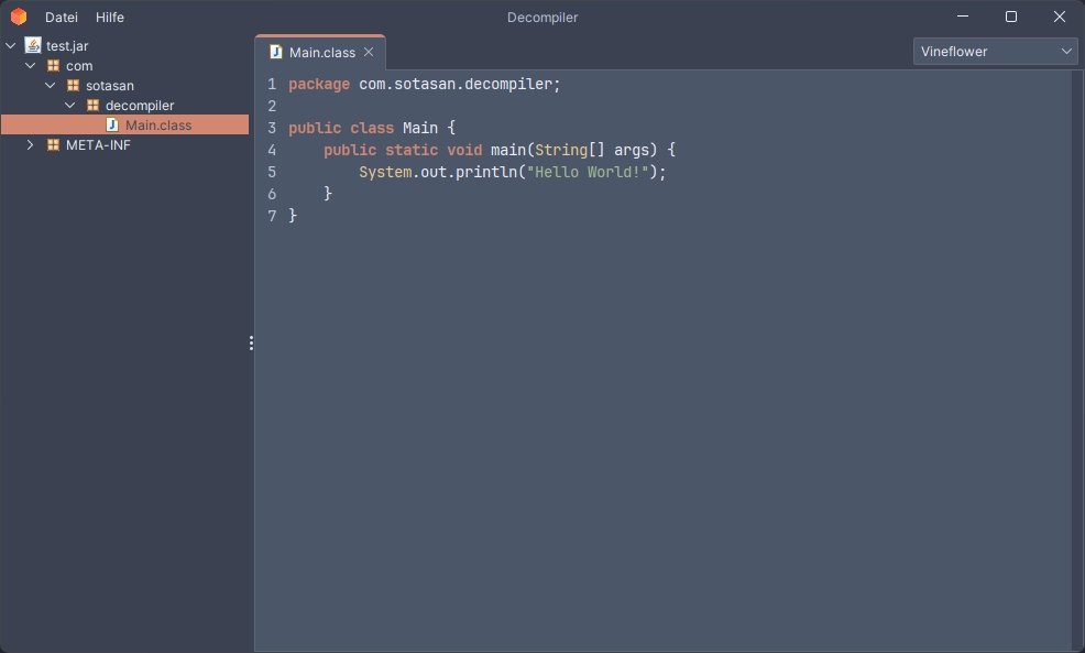 Decompiler je nástroj pro procházení Java archivů (JAR souborů), resp. dekompilaci tříd, pomocí čtyř různých dekompilátorů. Podporuje dekompilátory CFR, JD, Procyon a Vineflower.