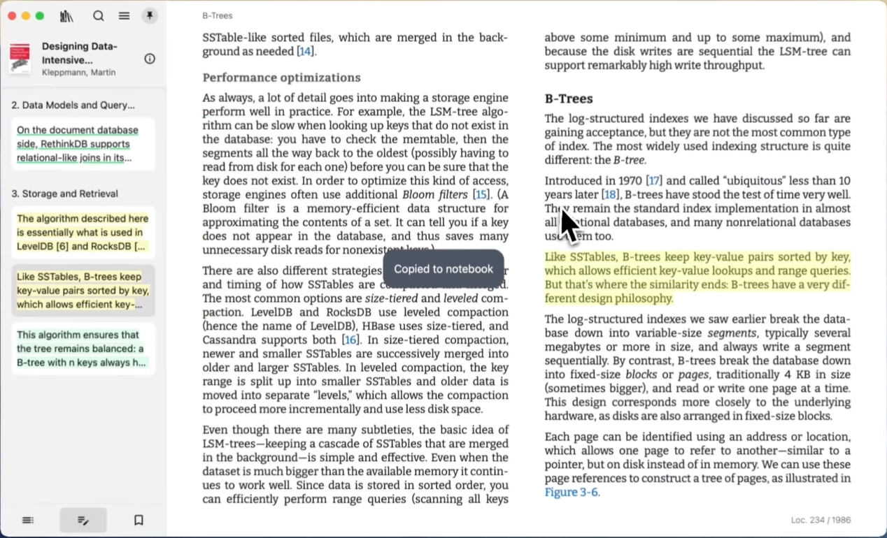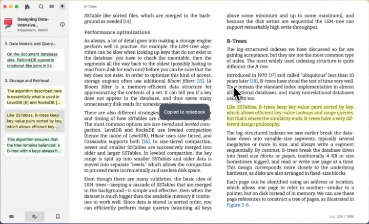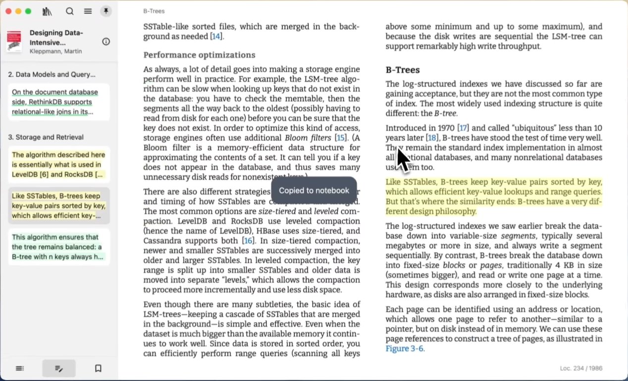 Umožňuje přidávání zvýraznění, záložek a poznámek. Lze získávat výňatky z knih a rozšiřovat je o poznámky, vyhledávat významy slov a termínů, či překládat texty pomocí DeepL.