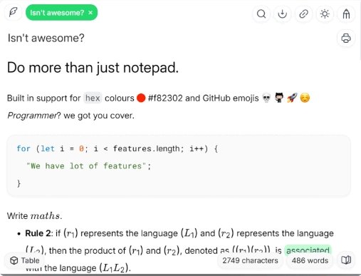 fylepad je nástroj pro psaní a úpravu poznámek v Markdownu. Poradí si s jednoduchými seznamy, tabulkami, vloženými zdrojovými kódy i pokročilým formátováním, kdy lze modifikovat použité barvy nebo styly písma. Automaticky ukládá každou změnu, umožňuje exportovat obsah do PDF nebo Markdown a podporuje práci s více soubory prostřednictvím záložek.