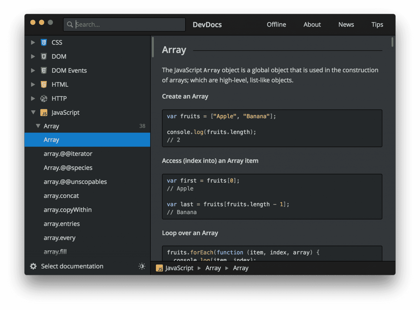 Offline prohlížeč API dokumentace pro vývojáře, který poskytuje přístup do více než 200 manuálů. Aplikace podporuje C, C++, CoffeeScript, CSS, DOM, Git, HTML, HTTP hlavičky a stavové kódy, JavaScript, jQuery, Markdown, PHP, Python, React, Ruby, SVG a další.