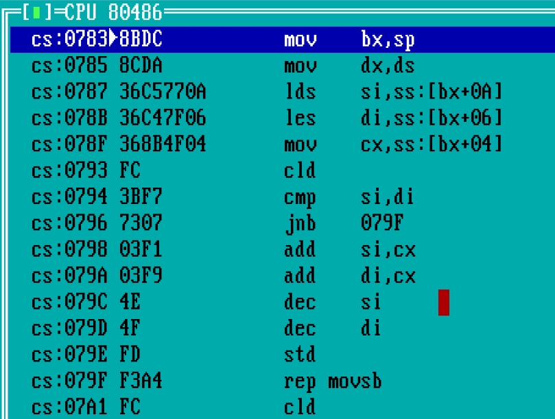 3. Bavíme se o tom, jestli řetězcové instrukce využívaly překladače. Ne o tom, jestli je využívali assembleristi. Nevím jak v raných verzích MSC, ale inline assembler byl až v TP4. Do té doby inline($F3/$A4) {rep movsb}