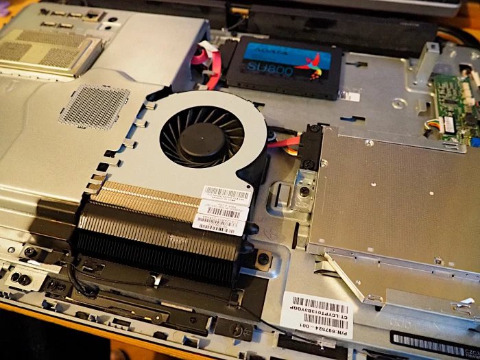 Líbí se mi konstrukce i design tohoto a-i-o PC, reproduktorky hrají ještě přijatelně a i dovnitř se leze dobře. Dva křížové šrouby, zbytek se vycvaká a dojde k odhalení základní desky a pozice pro úložiště. Uchycení chladiče na CPU vyžaduje demontáž bloku ven ze stroje a s ohledem na stav teplovodivé pasty po 10 letech provozu (suchá, křehká, de facto nefunkční) to bylo potřeba.