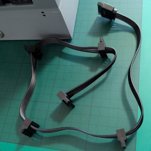 Tento napájecí zdroj má sice jen jeden SATA power konektor, ale to není žádný problém, dá se to snadno vyřešit pomocí správného rozdvojovacího nebo vícenásobného napájecího kabelu (bohužel zase Čína, holt nikde jinde jsem to nesehnal).