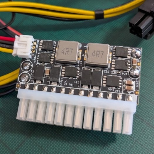 Zároveň jsem se z prostorových důvodů snažil, aby celá skříň byla co nejkompaktnější. Proto jsem místo klasického ATX zdroje zvolil zmenšenou variantu napájenou z externího 12V adaptéru (90W), který mi zbyl z původního NASu.