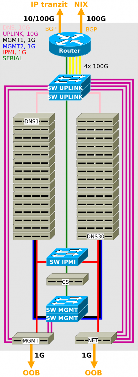 První 100GE DNS stack jsme zprovoznili na konci roku 2017. Koncept a popis zapojení DNS stacků je uveden v mém dřívějším článku. DNS stack tedy obsahoval 30 DNS serverů, MGMT server, dva switche pro připojení k MGMT serveru a pro IPMI konektivitu a HW router s ODF, přes které byly připojeny všechny 10GBit uplinky DNS serverů.
