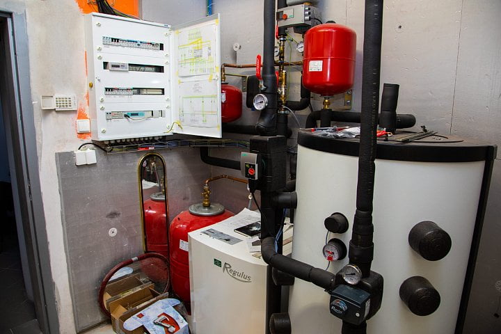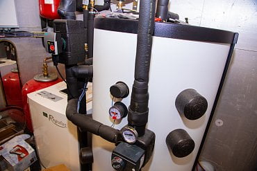 Voda z těchto nádrží se pak používá pro ohřev vody v jednotlivých bytech. Je tu celkem osmnáct bytů, v každém z nich je elektrický bojler, který pro předehřev používá teplo z našeho sálu,