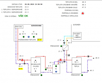 Při plánování existovala i varianta, že by se voda rozváděla přímo k serverům, ale kvůli přílišné složitosti se nakonec zvolilo toto řešení. V tuhle chvíli je tu 22 stupňů a v akumulačních nádržích je 48 stupňů, teď je požadavek na ohřev vody, takže máme dostatečnou spotřebu,