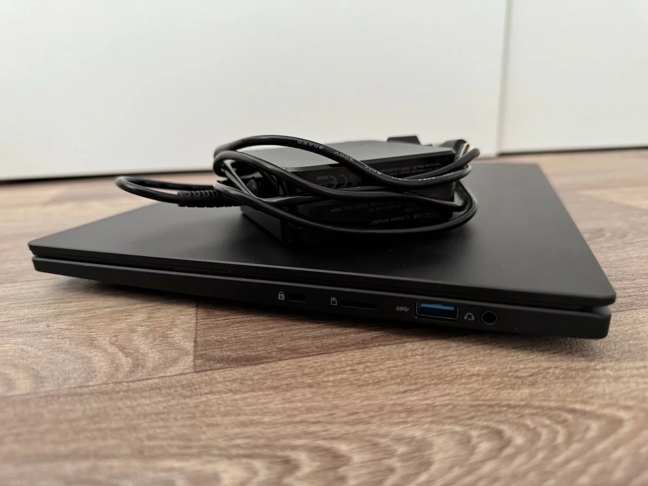 U toho se ihned zastavíme. Zdroj je trochu větších rozměrů, ale oproti jiným modelům s „cihlami“ jde vlastně o elegantní kus, který vám díru do tašky neudělá, protože váží 265 g. Notebooku dodává až 100 W přes USB-C, přičemž jsem byl schopný jej napájet i slabším adaptérem. Při jeho použití se ale v zátěži notebook vybíjel, takže hodně záleží na činnostech. Pro kancelářské využití můžete využít slabší adaptér, popřípadě Power Delivery z monitoru, ale při zatížení notebooku počítejte, že mu šťáva nemusí stačit.