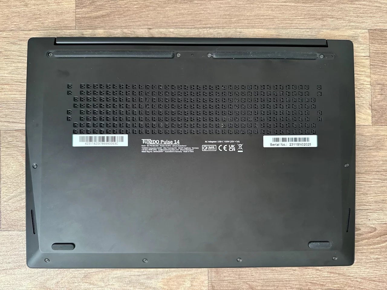 Tuxedo Pulse 14 je vyroben ze dvou hlavních materiálů: hliníku a plastu. Horní víko je hliníkové, ale například rám displeje je plastový stejně jako spodní díl. Jde o zajímavou kombinaci, která se ale kupodivu nijak nepodepisuje na váze. Notebook působí v rukách lehounce a váží 1,4 kg. Opravdu dobře se drží, hmotnost je dost vyvážená.