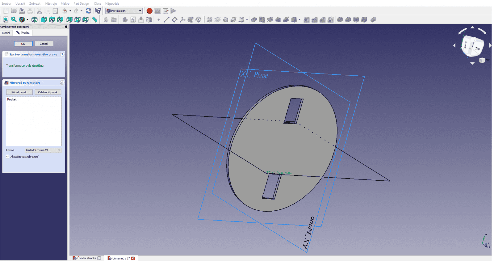 Pokud chceme vytvořit symetrický prvek, použijeme funkci zrcadlení. Prvek zrcadlíme podle roviny, přičemž zrcadlený tvar bude mít od této roviny stejnou vzdálenost jako originál jenom opačným směrem a bude stranově převrácený stejně jako při pohledu do zrcadla. V tomto případě využijeme základní rovinu dílu, jde však použít jakákoliv jiná rovina.