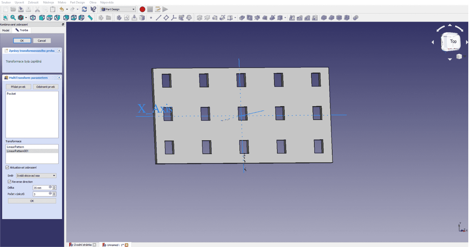 Pokud chceme vytvořit lineární pole ve dvou osách zároveň, tak vytvoříme vícenásobně transformovaný prvek. Zde napřed vybereme prvek, z kterého chceme pole vytvořit a pak pravým tlačítkem myši přidáme napřed vodorovnou a pak svislou osu. Podle zadaných parametrů se nám pak vytvoří rastr prvků.