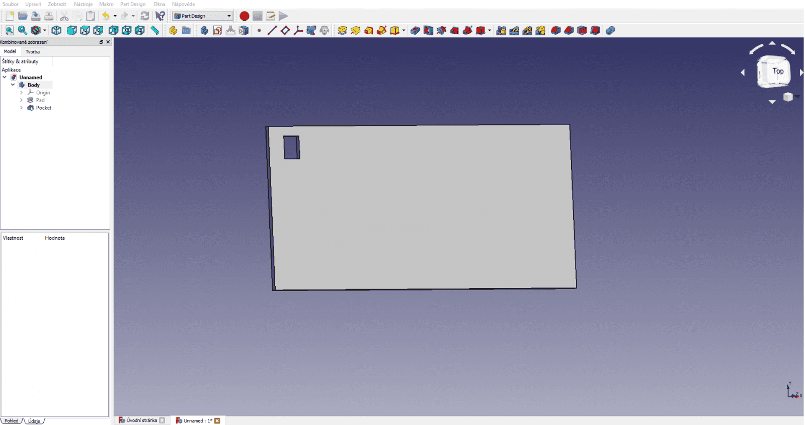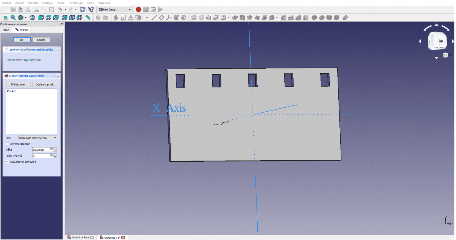 Nastane případ, kdy budete chtít na vašem modelu stejný prvek několikrát se stejným rozestupem. Jedna možnost je vytvořit několik náčrtů. To je však zdlouhavé a člověk u toho snadno udělá chybu. Proto existuje možnost vytvořit si pole prvků. Ukážeme si to na jednoduchém příkladu desky a obdélníkového výřezu.