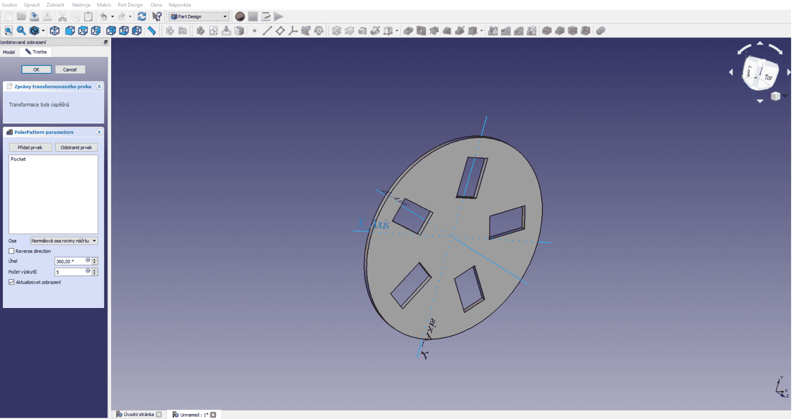 Podobný postup existuje i u rotačních dílců. V sekci Vytvořit prvek polární pole napřed vybereme prvek, pak zvolíme osu a zadáme počet výskytů a úhel rotace.