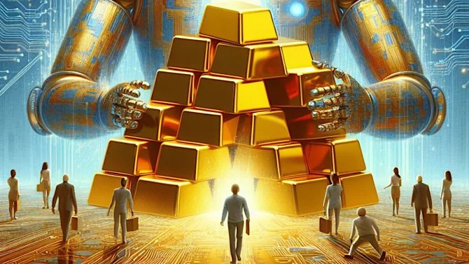 Obrázek k článku ukazuje, co si pod „AI a koncentrací bohatství“ představuje umělá inteligence, konkrétně Dall-E 3.