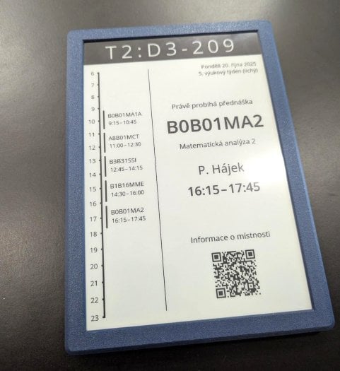 U nových učeben je vedle dveří vyveden ethernetový kabel, plánem tedy bylo mít zařízení, které může být napájené pomocí PoE. Bohužel, většina místností takovou přípravu nemá. Řešení s e-ink displejem proto umožní bateriový provoz. Původní řešení používalo displeje o velikosti 7,5 palce. Mimo jiné proto, aby bylo možné vytisknout rámeček na běžné 3D tiskárně.