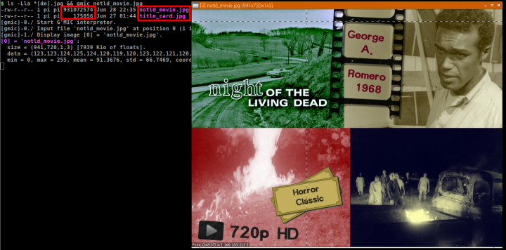 (notld_movie.jpg). Vidíme, že G'MIC 930 MB JPEG s embedovaným filmem normálně načte (vlevo). Vpravo: extraktor extrahuje