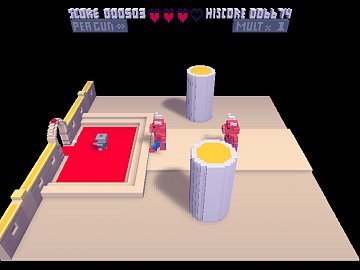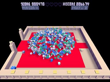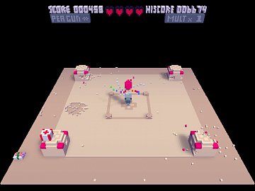 Vaší základní zbraní je pomalá laserová střelba. Pomocí bedýnek s bonusy, padajících z rozstřílených předmětů a vašich nepřátel, se dá arzenál na chvíli vylepšit. Některé kousky jsou opravdu originální. Můžete se změnit na v rytíře ničící monstra za pomocí svého meče nebo je zastavět krychlemi jako v Minecraftu. Maximálně destrukce však způsobí klasická bomba. Ta se sem tam v aréně objeví a po jejím sebrání kolem sebe šíří zkázu nejen pro zlosyny, ale i pro samotnou arénu. Ta je pak po výbuchu vždy děravá jako ementál.