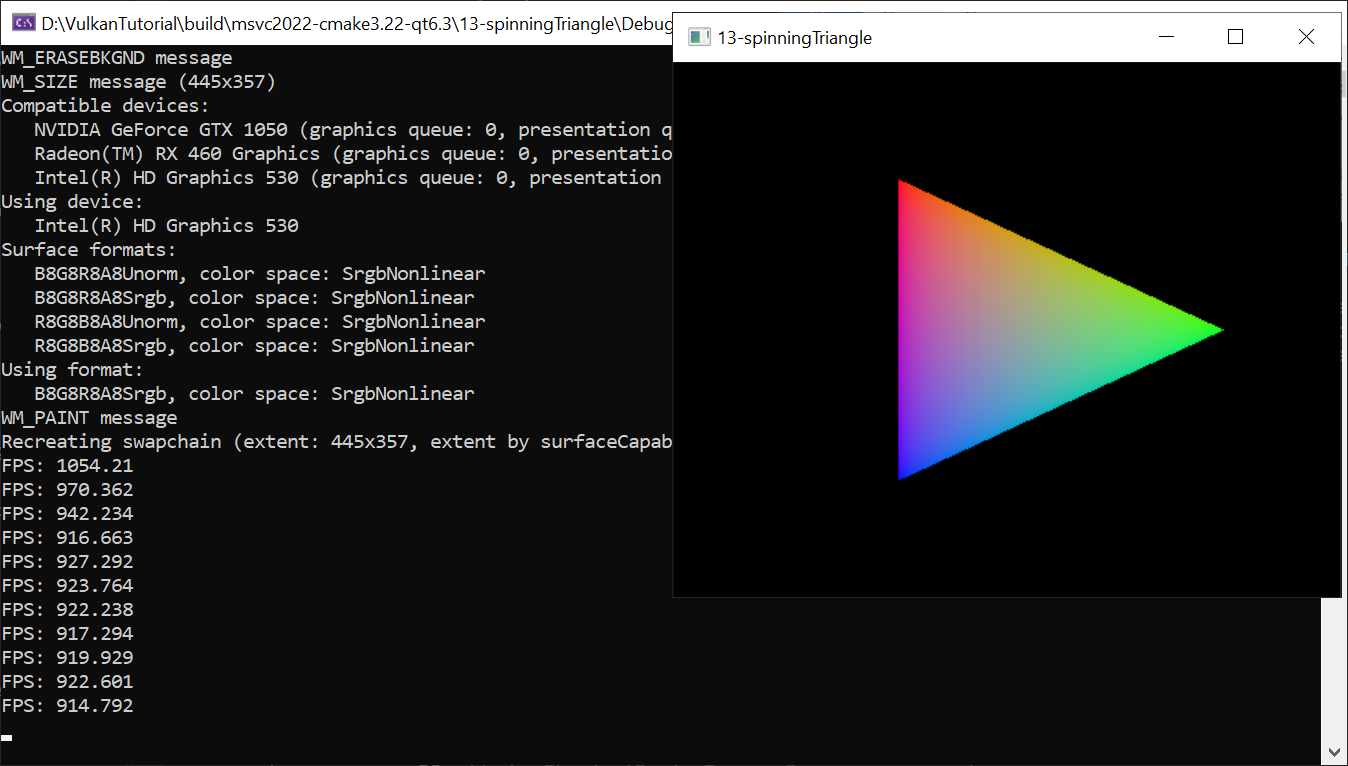 Z kódu frame callbacku nám zůstává již jen zavolání Device::acquireNextImageKHR() a command buffer recording, což je obojí stejné, jako v minulém díle, kromě změny příkazu rendrování trojúhelníku. Kódu rendrování trojúhelníku jsme se však již věnovali. Jsme tedy kompletně hotovi a po spuštění v konzoli vidíme výpis našich FPS: