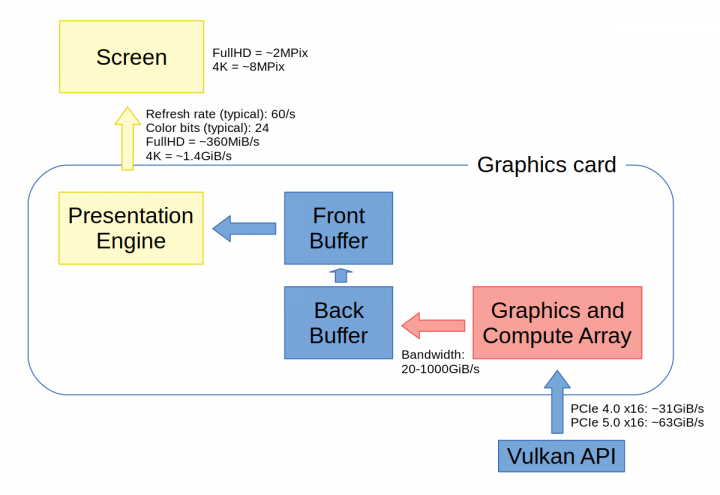 Samotné rendrování začíná u rozhraní Vulkan, které přes driver a následně nejčastěji přes PCIe sběrnici posílá práci grafické kartě. Grafická karta pak práci zpracovává za pomoci mnoha součástí, které bychom mohli souhrnně nazvat Graphics and Compute Array, česky snad grafické a výpočetní jednotky, či jen výpočetní jednotky, ať už se na nich počítá grafika či výpočty. Tyto výpočetní jednotky komunikují s grafickou pamětí, odkud čtou a zapisují data, a kam se do back bufferu zapisuje i výsledný obrázek. Na rozdíl od PCIe sběrnice, kde máme k dispozici dnes většinou asi 15–60 GiB/s podle verze PCIe, propustnost grafické paměti se u nynějších posledních generací diskrétních grafik pohybuje od 100 do 1000 GiB/s, tedy opravdu hodně, aby paměť sytila hladové výpočetní jednotky grafické karty, které dnes v hi-endu atakují počet deset tisíc a v low-endu diskrétních grafik zřídka klesají pod pětistovku.