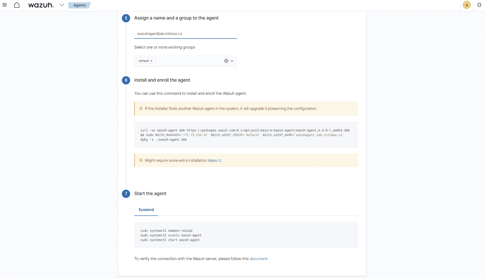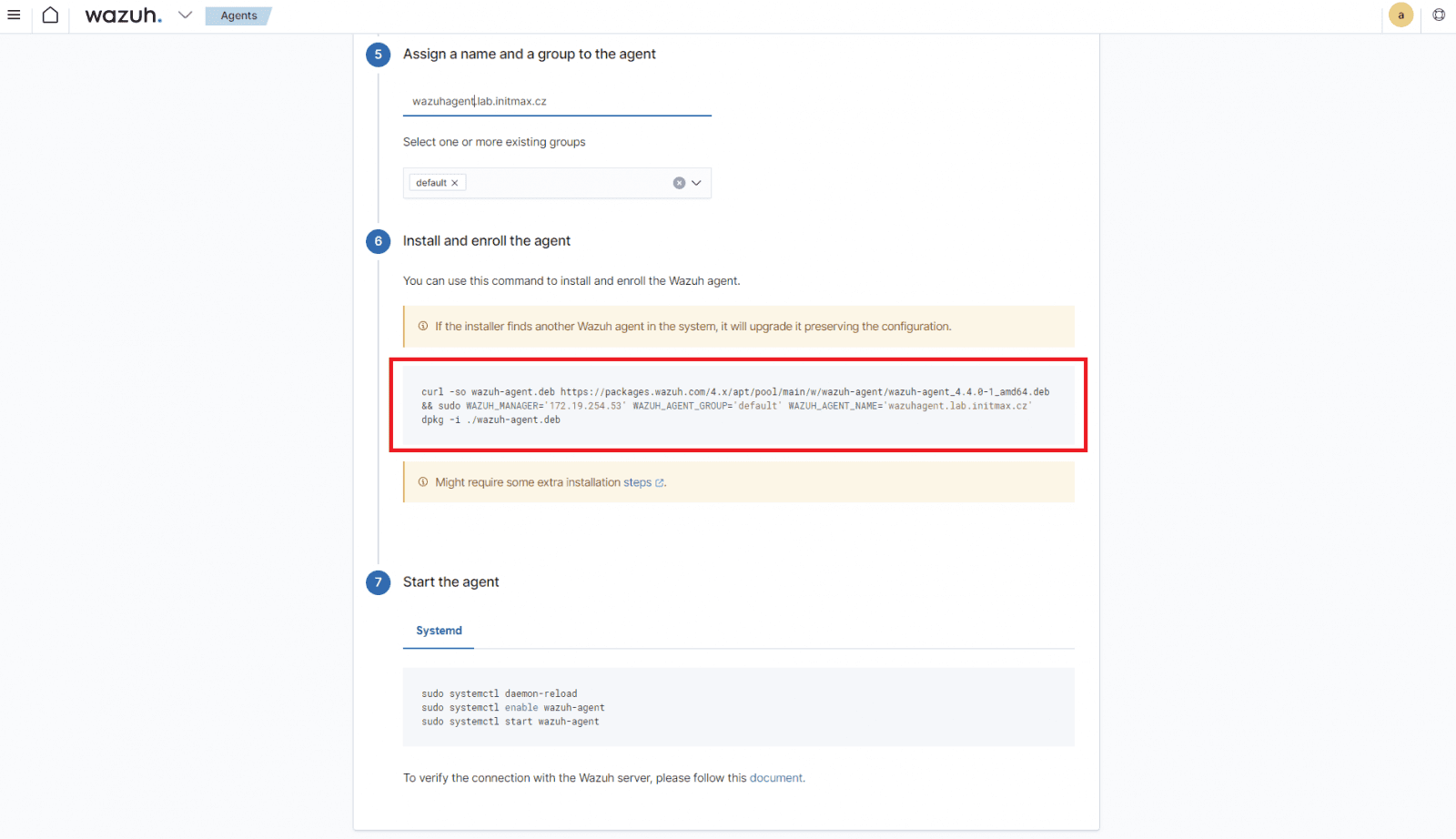 curl -so wazuh-agent.deb https://packages.wazuh.com/4.x/apt/pool/main/w/wazuh-agent/wazuh-agent_4.4.0-1_amd64.deb && sudo WAZUH_MANAGER='172.19.254.53' WAZUH_AGENT_GROUP='default' WAZUH_AGENT_NAME='wazuhagent.lab.initmax.cz' dpkg -i ./wazuh-agent.deb
