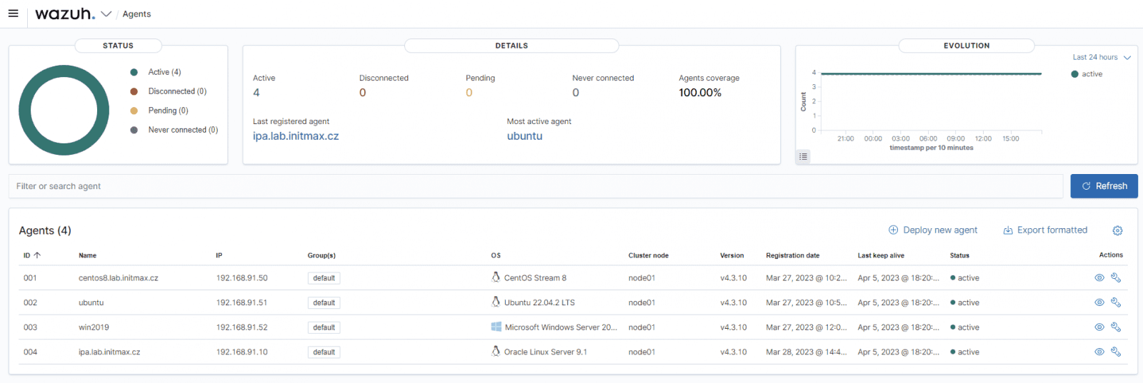Pokud vše proběhlo v pořádku, agent se zaregistruje, po chvíli jej uvidíme aktivního v sekci Agents a můžeme si zobrazit data, která posílá.