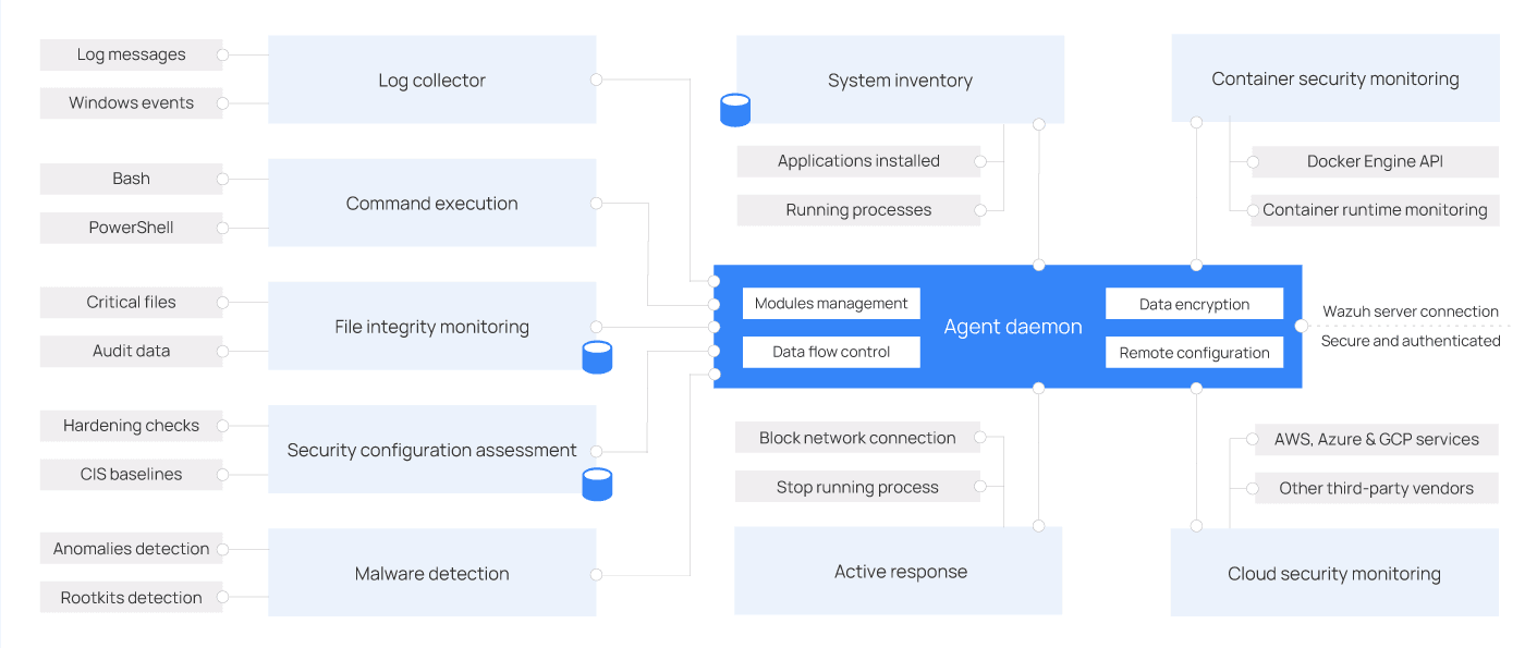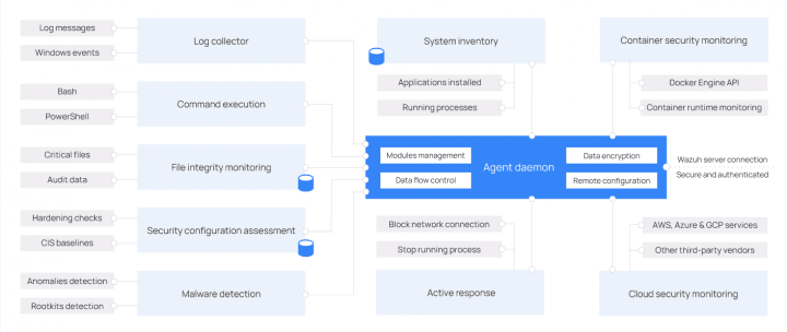 Agenti jsou nainstalovaní na koncových zařízeních, kterými mohou být například fyzické nebo virtuální servery, cloudové instance, kontejnery nebo uživatelské pracovní stanice. Jejich úkolem je sledování systému, na kterém jsou nainstalováni, a předávání informací Wazuh serveru k další analýze.
