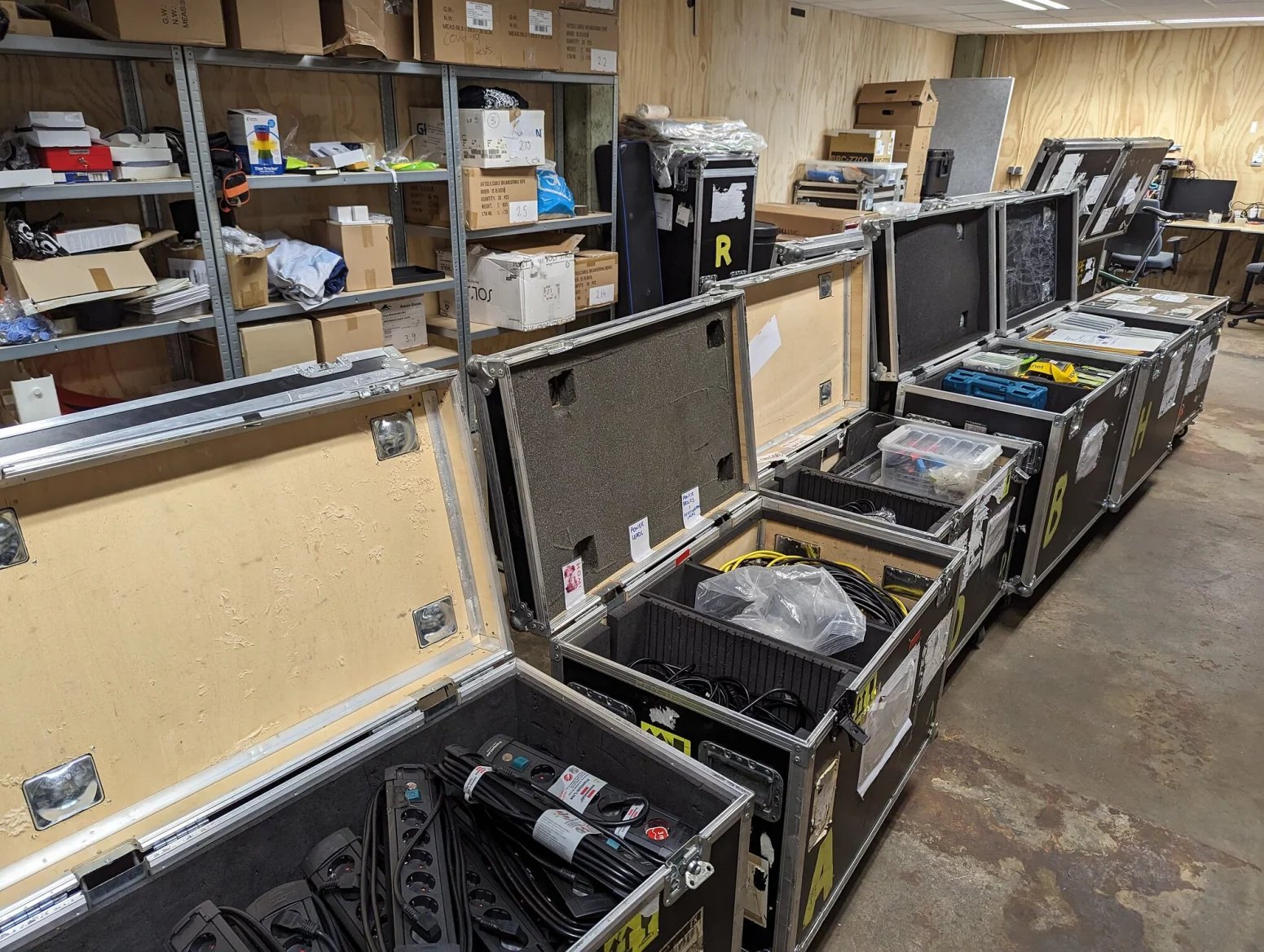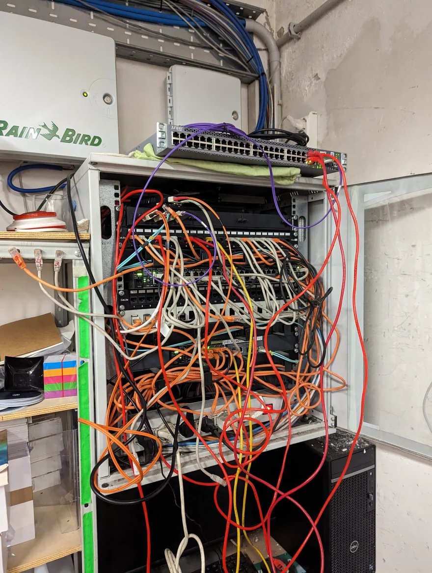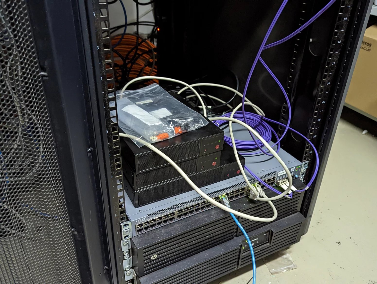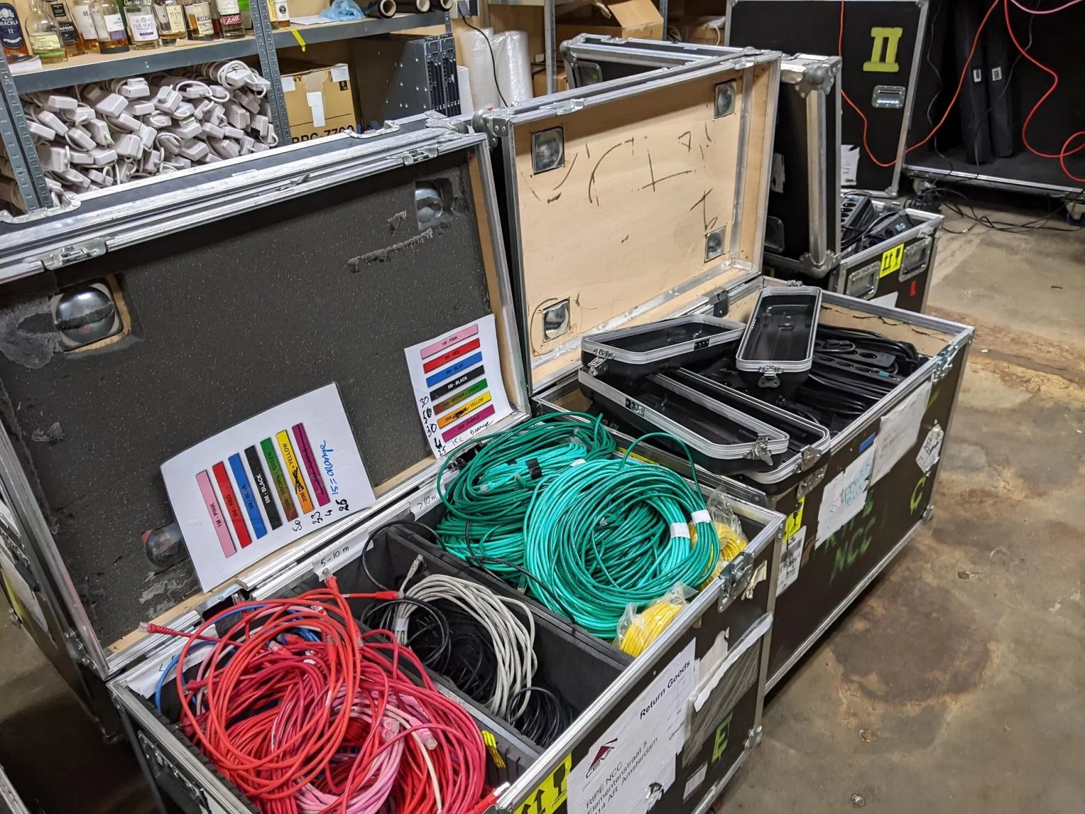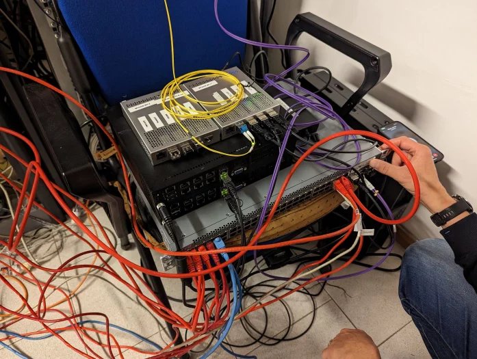 K tomuto účelu s sebou vozíme kompletní síť včetně dvou serverů, několika síťových přepínačů a flotily přístupových bodů Wi-Fi. Vše podstatné je postaveno na svobodných technologiích: směrování zajišťuje BIRD, firewall máme zařízen pomocí nftables, DNS řeší Knot Resolver, o DHCP se stará Kea a celé to spravujeme pomocí Ansible.