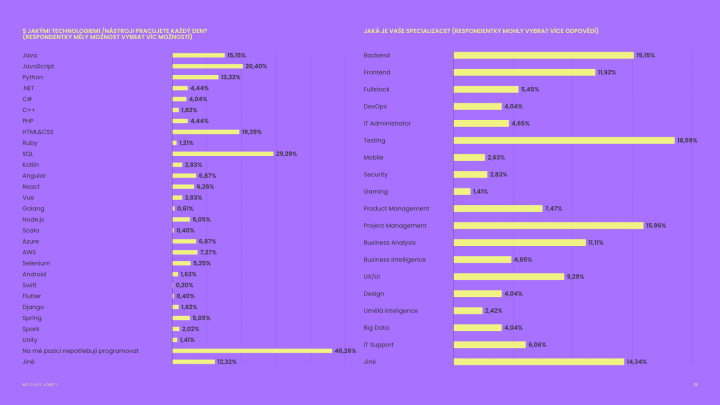 Ne každý IT specialista je programátor! Více než 46 % respondentů uvedlo, že na pozicích, které zastávají, nejsou vyžadovány znalosti programování. Většina respondentů pracuje jako testeři (18,6 %) a projektoví manažeři (16 %). Naopak v případě specializací na programování volí ženy nejčastěji Backend (15 %), Frontend (12 %) a Fullstack (5,4 %). Co se týče použitých technologií, nejvíce odpovědí bylo: SQL (29,2 %), JavaScript (20,4 %), HTML & CSS (19,3 %) a Java (15 %).