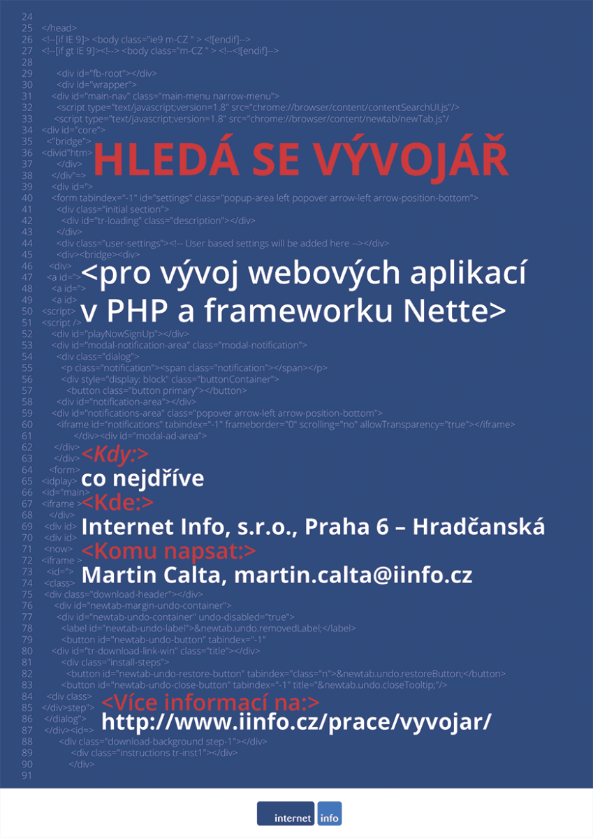 Pokud ovládátePHP, Nette a MySQL, rozumíte si s JavaScriptem, jste samostatní a pečliví při řešení úkolů a jste schopni spolupracovat s lidmi uvnitř menšího týmu, neváhejte a pošlete nám svůj životopis na adresu vyvojar@iinfo.cz. Potěší nás, pokud přiložíte reprezentativní ukázku kódu.