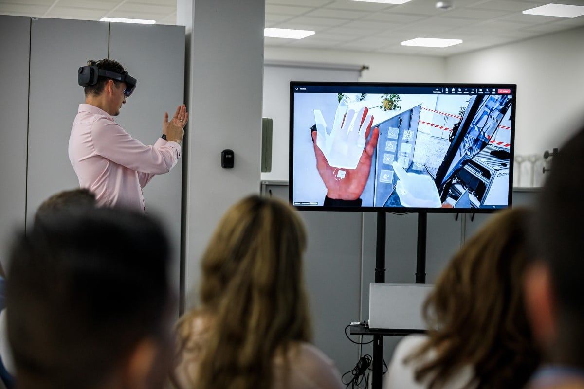Zdeněk Chalupa předvádí, jak brýle s funkcí rozšířené reality umožňují uživateli různě manipulovat s vybraným 3D modelem.
