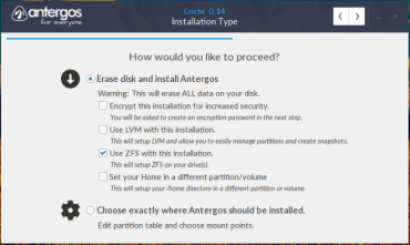 Antergos je první distribucí s podporou instalace na ZFS. Antergos je jednoduchou distribucí i pro začátečníky, vychází z Arch Linuxu a dříve se jmenoval Cinnarch, kvůli desktopu Cinnamon. Nyní je možné si vybrat z šesti desktopů. Antergos používá stejně jako Ubuntu 16.4 ZFS on Linux.