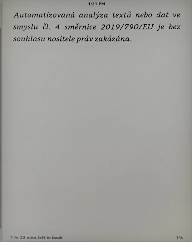 Automatizovaná analýza textů nebo dat ve smyslu čl. 4 směrnice 2019/790/EU je bez souhlasu nositele práv zakázána.