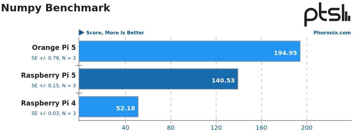 Ve většině testů vyhrálo Orange Pi 5, protože má v podstatě čtyři stejná velká jádra Cortex-A76 na 2,4 GHz jako Raspberry Pi 5, ale k tomu má ještě 4 malá jádra Cortex-A55 na 1,8 GHz. V průměru bylo Orange asi o 7 % rychlejší, než Raspberry.