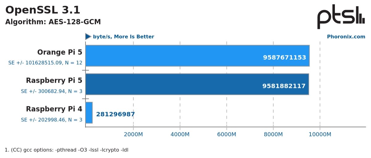Dobrou zprávou je, že Raspberry Pi konečně podporuje kryptografické rozšíření. AES je tak asi 30× rychlejší než na Raspberry Pi 4. V průměru je Raspberry Pi 5 asi 2,8× rychlejší než Raspberry Pi 4.