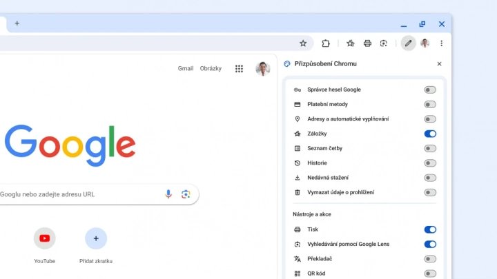 Pro uživatele je tu nově možnost přidat si na nástrojovou lištu vedle adresního řádku své oblíbené funkce. Stačí navštívit menu, poté Další nástroje a Přizpůsobit Chrome. Na bočním panelu se pak zobrazí nabídka tlačítek, která je možné umístit na lištu.