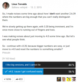 Po linuxovém jádru verze 3.19 bude následovat verze 4.0. Těsnou většinou o tom rozhodlo hlasování na Google+, kterého se zúčastnilo přes 29 tisíc hlasujících. Celkem 56 % z nich vybralo možnost povýšení verze na 4.0, zatímco zbytek si přál pokračovat v trojkové řadě. Linus tedy vydal další RC verzi už s označením 4.0-RC1.