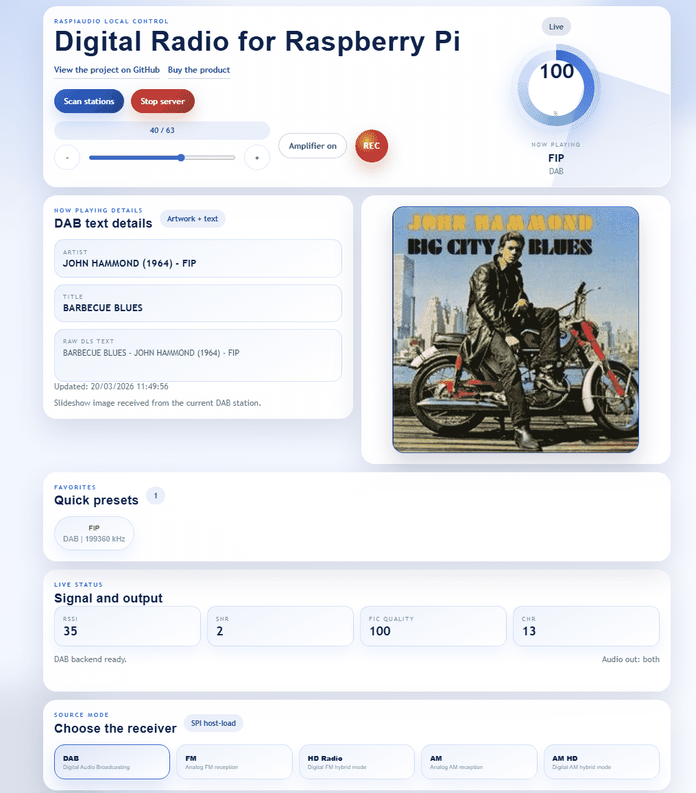 Pařížská firma RaspiAudio představila HAT pro Raspberry Pi s digitálním rádiem. Umožňuje příjem AM, FM, DAB, DAB+ a HD Radio (v USA). HAT se připojuje přes 40pinový konektor a je kompatibilní s Raspberry Pi Zero až Pi 5.